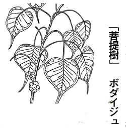覚樹(かくじゅ)・思惟樹(しゆいじゅ)・道樹(どうじゅ)とも漢訳され、苦行(くぎょう)では悟(さと)りを得られないことを知った釈尊(しゃくそん)は、ウルヴェーラ村・ネーランジャー河のほとりの菩提樹の下に坐(すわ)り、悟(さと)りを開かれた。 この菩提樹は、高さ二十メートル、幹の直径は一.二メートルにもなる巨木で、葉形は独特なハート型で鮮やかな青緑色である。