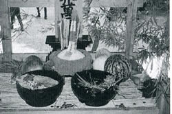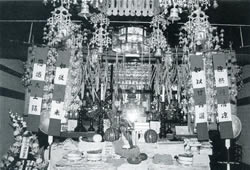 一般的には、本堂中央に精霊棚を設け、餓鬼飯・水を供えます。餓鬼飯には小幡を数本立て、経文の一句を書き、中央の小幡には「南無妙法蓮華経有縁無縁法界万霊」と書きます。また、四隅に「施餓鬼幡」という青・黄・赤・白・黒の五色の大幡を立てます。四枚の施餓鬼幡にはそれぞれ如以甘露灑・除熱得清涼・如従飢国来・忽遇大王膳(甘露をそそがれることにより熱が除かれ清涼を得るがごとく・飢餓の国から来た人がたちまち最高のご馳走の前に座るがごとく)と書かれています。これは『法華経授記品第六』で、お釈迦さまの弟子たちが、お釈迦さまから「あなたは未来世において成仏する」という予言を受けた、その悦びを表現した言葉です。施餓鬼法要の時に、導師はこの言葉を唱えながら卒塔婆に漉水されます。